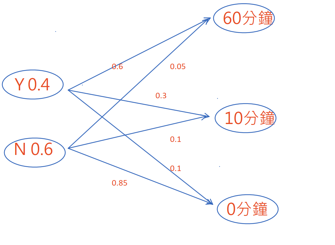 小明是個小屁孩喜歡打電動。問媽媽可不可以去打電動,媽媽有 0.4 的機率回答可以,有 0.6 的機率回答不可以。如果媽媽說可以,因為媽媽總是可以找到理由取消這個許可,例如,怎麼功課還沒寫、小提琴還沒拉、沒有把飯吃完,所以不是媽媽說可以就一定可以玩到爽;事實顯示這種情形小明有 0.6、0.3、0.1 的機率可以玩60分鐘、10分鐘、0分鐘。如果媽媽說不可以,因為媽媽可能在忙沒空理小明,所以不是媽媽說不可以就一定不能玩;事實顯示這種情形小明有 0.05、0.1、0.85 的機率可以玩60分鐘、10分鐘、0分鐘。所以如果沒有問媽媽,什麼是小明打電動的時間的機率分配?