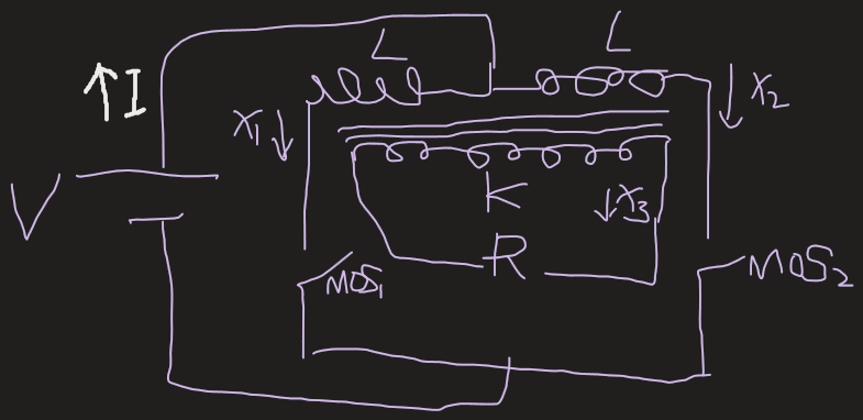 - 高頻變壓器,頻率數十 kHz。 個高頻變壓器前端和後端是隔離的,前端是並聯,後端是 個串聯。從高頻變壓器觀點來看,MOSFET兩路驅動產生正負方波輸入, 代表 loading 的等效電阻,電壓和電流是 和 ,輸出電壓和電流經過串聯 個高頻變壓器加總電壓之後是 。電流是 。